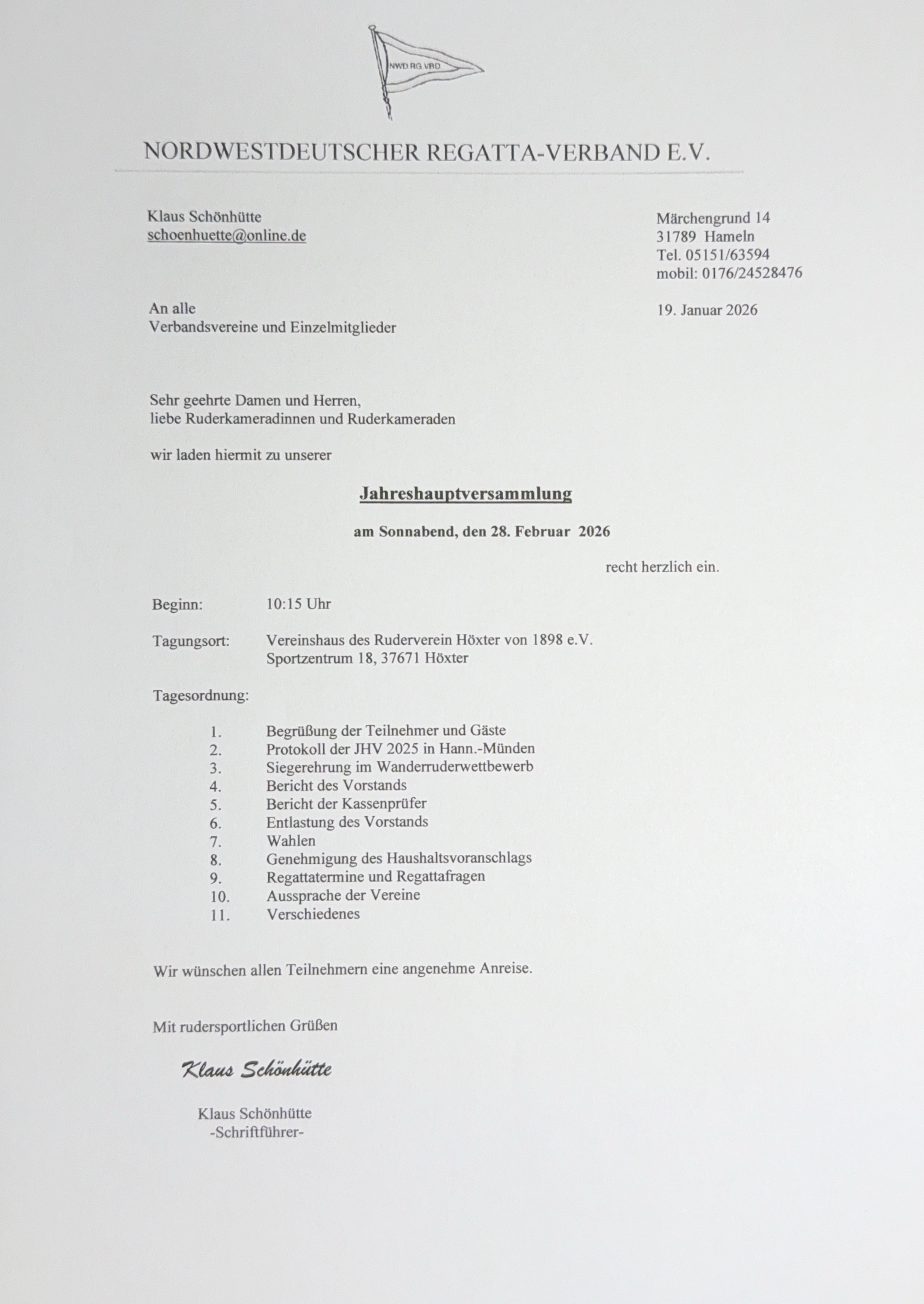 am Samstag, 28. Februar 2026 findet um 10:15 Uhr die Jahreshauptversammlung des Nordwestdeutschen Regatta-Verbands in Höxter statt. Ich bitte um rege Teilnahme!